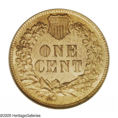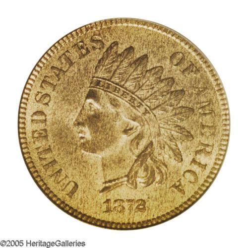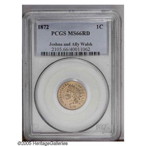 <B>1872<1C> MS66 Red PCGS.</B></I> Ex: Ally Collection. Like the 1871, the 1872 was produced in limited numbers because the mint's supply of Half Cents and Large Cents for recoinage had dwindled to unacceptably low levels. The 1872, in turn, would also suffer from the melting that affected many late date Half Cents and Large Cents, as well as some of the earlier issues in this series. Apparently, the public redeemed many 1872 Cents in the 1873-1875 period, all of which were undoubtedly melted by the Mint to provide copper for its delivery of Cents in those years.<BR> The 1872 is now regarded as a key date Indian Cent in all grades, particularly those above the Mint State threshold with any degree of original luster remaining. This is the first Gem (MS66) example with fully intact luster that we have ever handled. The obverse is sharply, nearly fully struck with original copper-golden luster and a richly frosted sheen. The reverse is equally as original with similar color. Some mottled russet-brown patina is sprinkled over each side lending a fully original appearance. The strike is slightly softer on the upper right portion of the reverse. Both sides are equally free of distracting blemishes. One of only two so graded examples at PCGS, with none finer (11/05).<BR><I>From The Joshua and Ally Walsh Collection of United States Cents.</B></I>