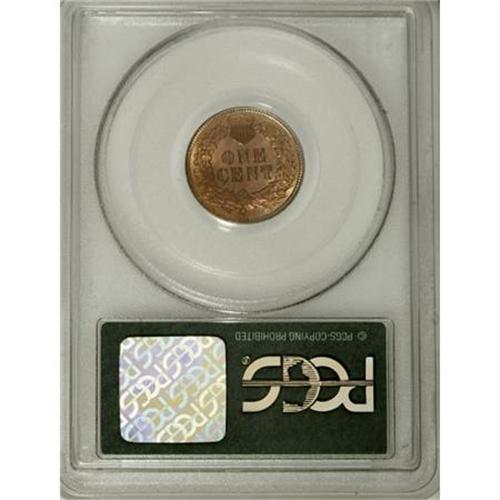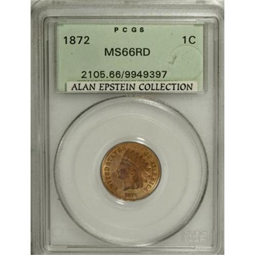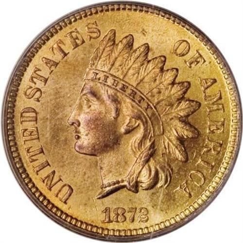 <B>1872 1C MS66 Red PCGS.</B></I> Q. David Bowers' <I>Guide Book of Flying Eagle and Indian Cents </B></I>has some cogent observations concerning the 1872 issue: "These cents were struck in quantities similar to the 1871. Aside from the 1877, this is the toughest date to find today. The planchets made from the recoinage melt were not of a consistent quality. Most coins of this date are streaky due to uneven alloy mixes. Many examples were poorly struck or are found with missing detail due to some liquid, such as machine oil, getting on the planchets or dies. ... It is very difficult to find attractive, problem-free examples. Most are poorly struck, or are struck through machine oil. Any attractive problem-free example should be considered for your collection. One Detroit collector, Carl Herkowitz, spent 25 years buying problem-free examples of this date. Even so, he had a difficult time finding more than 200 pieces."<BR> As Bowers alludes to, the cent mintages of the 1870s were influenced by the Mint's decision to recoin older minor coinage that had been turned in, and by the middle of the decade the decision had been made to simply reissue the newer bronze cents without recoining them at all, a situation that would lead to the rarity of the low-mintage 1877 Indian cent with which the 1872 issue is closely identified. Another similarity is the Shallow N reverse, which both the 1877 business-strike cents and some 1872 cents have.<BR> The present business-strike 1872 has the Bold N reverse, as used on the 1877 proof coins. It is simply a phenomenally lovely example of this date, despite Bowers' description of a "typical" coin above. Both sides show coruscating luster radiating from surfaces that are light tan-orange, with glints of greenish-yellow. The strike is full or virtually so, despite a die that shows some hints of fatigue: the upper portion of the Indian's ribbon is missing from die lapping, so that only three and a half diamonds show. On the reverse a couple of die cracks traverse the lower ribbon, and another joins the upper left wreath to the rim.<BR> This piece is one of two 1872s graded MS66 Red at PCGS, with none finer (7/07). By way of comparison, there are six 1877 Indians in MS66 Red, again with none finer. Certified in an older green-label holder.<I><BR>From The Santa Fe Collection.</B></I><BR><BR><B>Coin Engraver:</B> James B. Longacre<BR><BR><b>Shipping:</b> Coins & Currency (<a target="_blank" href="http://www.heritageauctions.com/common/shipping.php">view shipping information</a>\)