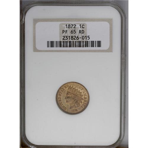<B>1872<1C> PR65 Red NGC.</B></I> While high quality proofs of the 1872 are more plentiful that similarly dated business strikes, the former are still deservedly rare coins at the Gem Red level of preservation. Indeed, NGC and PCGS combined have certified fewer than 100 pieces in PR60 and finer with the Red designation, of which 25 grade PR65, along with 10 pieces certified higher. This is a lustrous specimen striking with needle sharp definition throughout. The dominant color on both sides is orange-red in shade, although some speckles of slightly deeper hues are noted. A cameo-like effect is apparent when the coin is tilted beneath a light source. A small linear mark is noted in the field below the N of CENT. Census: 13 in 65, 3 finer (1/06).