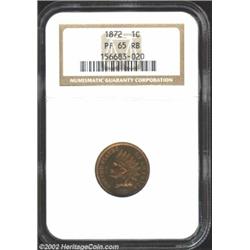 1872 1C PR65 Red and Brown NGC. Evenly and naturally mellowed to an autumn-brown hue, with remnants of red about the devices. A desirable proof due to the scarcity of business strikes and a legitimate scarcity as a Gem. One tiny planchet flake is seen at the base of the reverse.From the Robert Tarr, Sr. Collection. Important notice: We expect to be auctioning lots at the rate of 200-250 per hour. Sometimes eBay Premier live bid software cannot keep up with that pace, so we strongly recommend that you place a realistic proxy bid now as insurance to avoid disappointment. Also please note that all Heritage/CAA lots purchased through eBay Premier carry a 20% Buyer's Premium. Please make sure you read the Terms and Conditions.