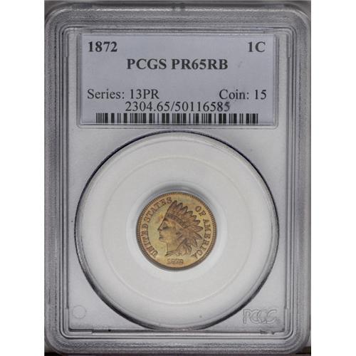 <B>1872<1C> PR65 Red and Brown PCGS.</B></I> Highly reflective surfaces show atop this, copper-gold, light green, and crimson colored proof Gem. An eye appealing piece that displays boldly struck devices. A couple of tiny flecks are noted on each side. Population: 63 in 65, 6 finer (4/06).<BR><I>From The Empire Tree Collection.</B></I>