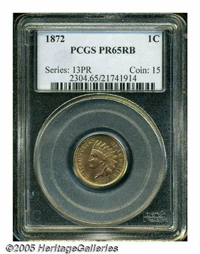 <B>1872<1C> PR65 Red and Brown PCGS.</B></I> Pleasing golden-tan patina is a touch deeper on the reverse. The design elements are adequately impressed, though the second diamond from the top is a tad soft of the right (facing) side. The surfaces are well preserved. A tiny fleck within the O of ONE is mentioned for accuracy. Population: 61 in 65, 3 finer (4/05).