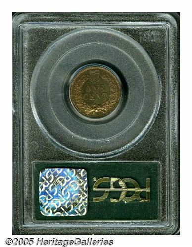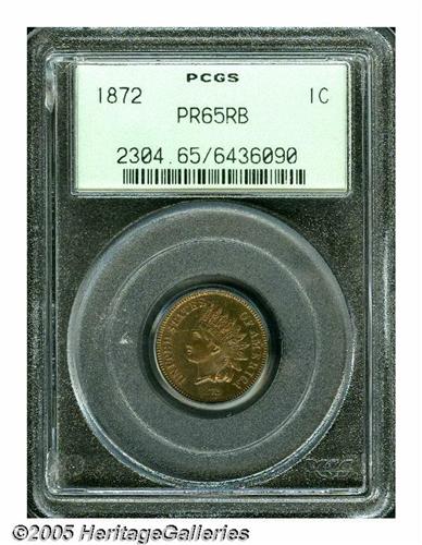 <B>1872<1C> PR65 Red and Brown PCGS.</B></I> Woodgrain-like, variegated purple and deep golden patina overlays the noticeably reflective and boldly defined surfaces. The 1872 enjoys added popularity due to its difficulty as a business strike.
