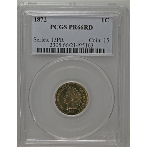 <B>1872<1C> PR66 Red PCGS.</B></I> Proof 1872 cents are much more plentiful in today's hobby than Mint State examples of the same date. This is not to say that the present PR66 Red specimen is common. Far from it. PCGS has seen only seven 1872 cents at this grade level, and there are none higher finer (8/06). The present example was struck from the obverse die that displays a die scratch (as produced) on the headband after the Y in LIBERTY. The fully brought up features reveal some soft, honey-golden color and a couple of minor carbon flecks confined to the obverse. These are seen only as the coin is rotated under a light source.