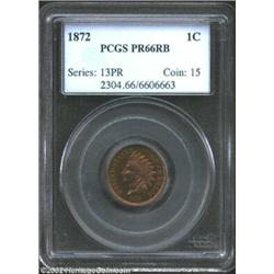 1872 1C PR66 Red and Brown PCGS. All proofs of this year are struck from a modified reverse die that shows a bulging right pendant on the T in CENT. As with most proofs of this issue, this piece shows a streaky overlay of brown patina, apparently caused by improper mixture of the copper alloy. The fields are deeply mirrored with deeper color on the obverse and the reverse several shades lighter in hue.From the "Newmismatist" Collection; the All-Time #1 PCGS Registry Set. Important notice: We expect to be auctioning lots at the rate of 200-250 per hour. Sometimes eBay Premier live bid software cannot keep up with that pace, so we strongly recommend that you place a realistic proxy bid now as insurance to avoid disappointment. Also please note that all Heritage/CAA lots purchased through eBay Premier carry a 20% Buyer's Premium. Please make sure you read the Terms and Conditions.