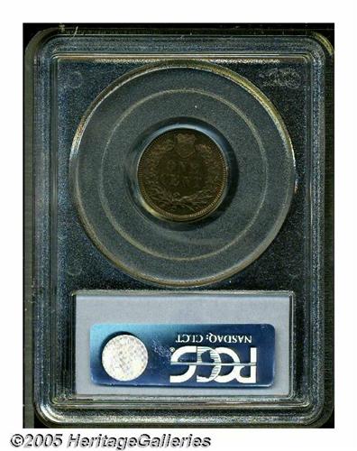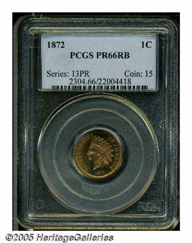 <B>1872<1C> PR66 Red and Brown PCGS.</B></I> Fully struck with bright red-gold toning on the obverse, where semi-reflective fields and pristine surfaces are evident. The reverse has a coating of deep purple-brown color, and is likewise immaculately preserved. A technically impressive Premium Gem. Population: 3 in 66 Red and Brown, 0 finer in Red and Brown (6/05).