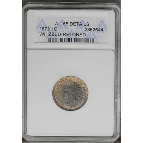 <B>1872<1C>--Whizzed, Retoned--ANACS. AU55 Details.</B></I> FS-008.9, Snow-1. This low mintage cent is lacquered and features deep multi-color toning. The surfaces are nonetheless lightly granular when viewed beneath a loupe.