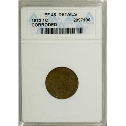<B>1872 1C --Corroded--ANACS. XF45 Details.</B></I> NGC Census: (25/226). PCGS Population (56/193). Mintage: 4,042,000. Numismedia Wsl. Price for NGC/PCGS coin in XF45: $454. (#2103)<BR><BR><B>Coin Engraver:</B> James B. Longacre<BR><BR><b>Shipping:</b> Coins & Currency (<a target="_blank" href="http://www.heritageauctions.com/common/shipping.php">view shipping information</a>\)