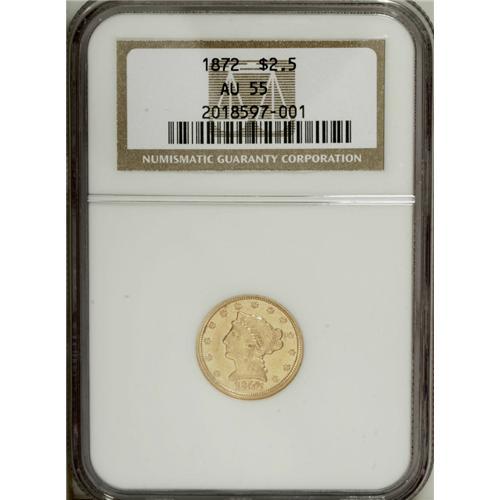 <B>1872 $2 1/2 AU55 NGC.</B></I> Partially reflective, like most of the mintage of 3,000 coins, despite light wear. Well struck with minor abrasions that pepper the amber-gold surfaces. Census: 16 in 55, 29 finer (11/06).<BR><BR><b>Shipping:</b> Coin/Currency (<a target="_blank" href="http://www.heritageauctions.com/common/shipping.php">view shipping information</a>)