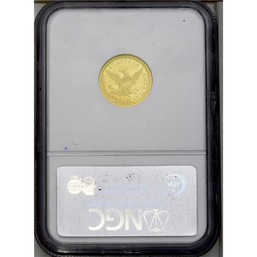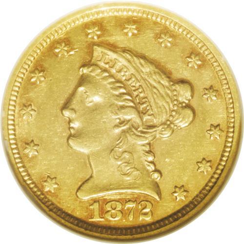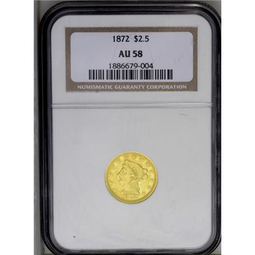 <B>1872<$2 1/2> AU58 NGC.</B></I> A rare and underrated issue at all levels of preservation, the 1872 was produced to the extent of just 3,000 business strikes and 30 proofs. Akers states that high grade (Mint State) representatives of this issue are more rare than well preserved proofs. This is an important near-mint example with only typical rub and a smattering of mostly small circulation marks. The bright yellow-gold surfaces exhibit bold definition that wanes a little over the highpoints of Liberty's haircurls and the eagle's left (facing) leg feathers. 1872 quarter eagles seldom appear at auction. Census: 20 in 58, only 9 are finer (6/06).