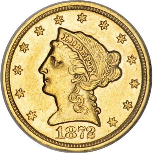 <B>1872 $2 1/2 AU58 NGC.</B></I> This boldly struck rare date quarter eagle features khaki-gold toning. The borders and devices display luminous luster, and abrasions are limited to a couple of noticeable marks near the chin. A scant 3,000 pieces were struck, and only a handful remain in Mint State. Census: 22 in 58, 10 finer (2/08).<BR><BR><B>Coin Engraver:</B> Christian Gobrecht<BR><BR><b>Shipping:</b> Coins & Currency (<a target="_blank" href="http://www.heritageauctions.com/common/shipping.php">view shipping information</a>)