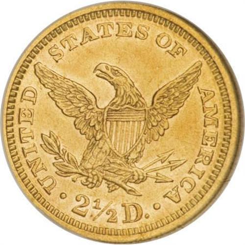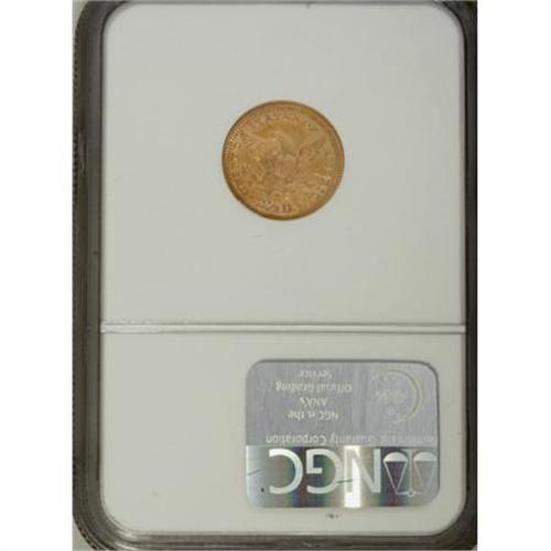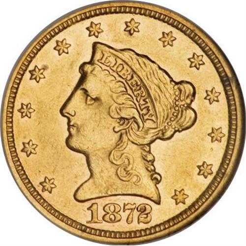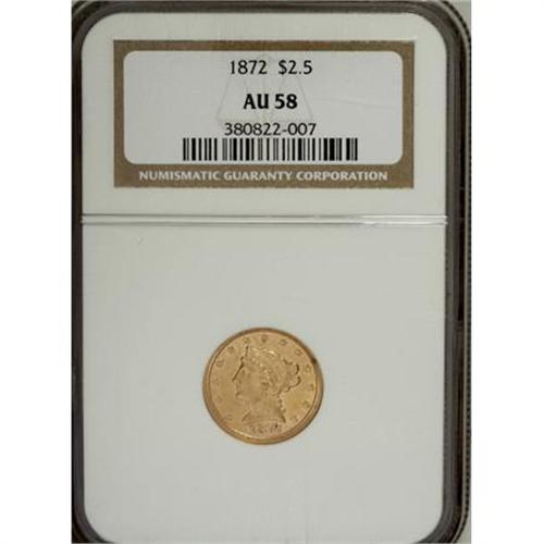 <B>1872 $2 1/2 AU58 NGC.</B></I> The 1872 quarter eagle, from a mintage of 3,000 business strikes, is difficult to locate in all grades. The apricot-gold surfaces of this near-Mint example displays luster in the recessed areas, and an attentive strike imparts strong definition to the design elements. Minute ticks are scattered over both sides.<BR><BR><B>Coin Engraver:</B> Christian Gobrecht<BR><BR><b>Shipping:</b> Coins & Currency (<a target="_blank" href="http://www.heritageauctions.com/common/shipping.php">view shipping information</a>)