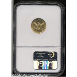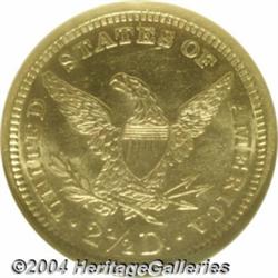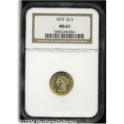 <B>1872<$2 1/2> MS63 NGC.</B></I> The 1872 quarter eagle is a low mintage, low availability issue with an original production run of only 3,000 pieces. This is one of the three finest examples known--two have been graded as such by NGC and one by PCGS. The striking details on this piece are well defined overall with only slight weakness noted on the eagle's left (facing) leg. The fields are bright and sparkle with semi-prooflikeness, and there are no obvious or detracting abrasions on either side--just the usual small marks that make the coin an MS63. Orange-reddish patina surrounds the margins. <BR><BR><B>Important notice:</B> Heritage usually auctions material at the rate of 200-250 lots per hour. On some occasions eBay Live bid software or the Internet may not be able to keep up with the pace of the auction. We recommend placing a realistic absentee bid now as insurance to avoid disappointment. Occasionally the auctioneer may eliminate or reject an eBay Live bid, and the auctioneer may also reopen a lot after the close of the eBay live bidding (usually because we missed an audience bid), and may reject your bid even if it shows you as the winning bidder. By bidding via eBay Live, you agree that Heritage may award the lot to another bidder at its sole discretion under the circumstances described above or any other reasonable circumstances. Since eBay bids are not shown to us until we open the lot on the floor, we treat those bids just like floor bids. In most cases the floor responds before the eBay bid is presented to us, due to Internet lag time, so for consistency we have made it a policy that floor bids are always considered first over tie eBay live bids. Also please note that all Heritage lots purchased through eBay Live carry a 20% Buyer's Premium. Please make sure you read the Terms and Conditions before you bid. </span></font></tr></table></td></tr></table>