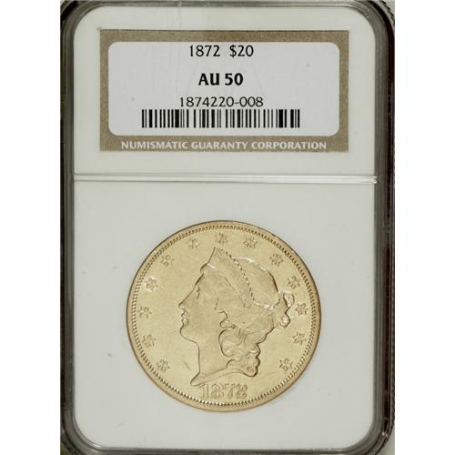 <B>1872 $20 AU50 NGC.</B></I> NGC Census: (38/427). PCGS Population (49/243). Mintage: 251,880. Numismedia Wsl. Price for NGC/PCGS coin in AU50: $685. (#8963)<BR><BR><b>Shipping:</b> Coins & Currency (<a target="_blank" href="http://www.heritageauctions.com/common/shipping.php">view shipping information</a>)