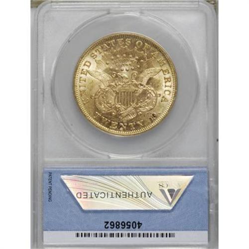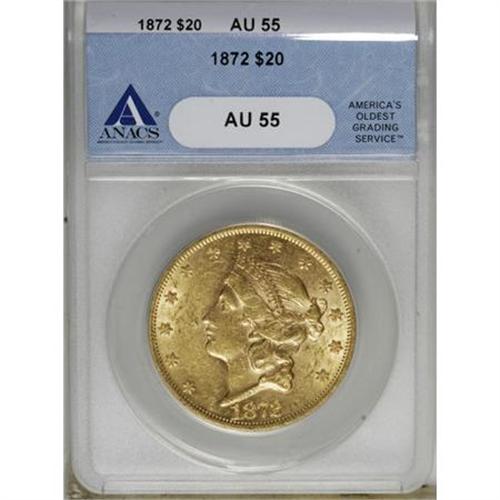 <B>1872 $20 AU55 ANACS.</B></I> This Choice AU twenty dollar retains a fair amount of luster on its bright, yellow-gold surfaces. Generally well defined, with a scattering of light to moderate contact marks, the most notable located behind the D in the denomination.<BR><BR><B>Coin Engraver:</B> James B. Longacre<BR><BR><b>Shipping:</b> Coins & Currency (<a target="_blank" href="http://www.heritageauctions.com/common/shipping.php">view shipping information</a>)