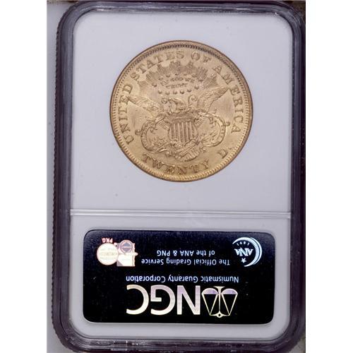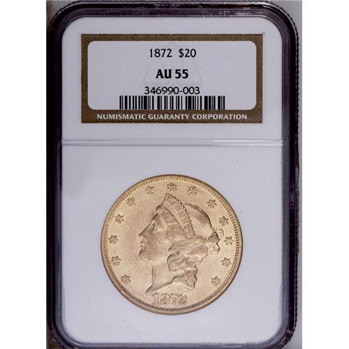<B>1872<$20> AU55 NGC.</B></I> Attractive reddish highlights and semi-prooflike tendencies, but a rather scuffy appearance on the obverse. Typically struck and highly lustrous, with slight friction on the highpoints. Somewhat scarce in AU condition or better.