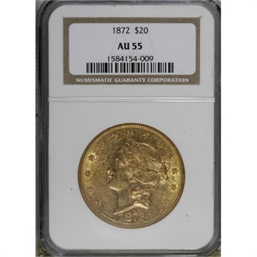 <B>1872 $20 AU55 NGC.</B></I> While Liberty's hair shows a degree of the usual softness, the reverse of this Type Two double eagle is uncommonly well-defined. Lightly abraded with essentially intact luster in the yellow-gold fields.<BR><BR><B>Coin Engraver:</B> James B. Longacre<BR><BR><b>Shipping:</b> Coins & Currency (<a target="_blank" href="http://www.heritageauctions.com/common/shipping.php">view shipping information</a>)