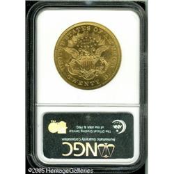 <B>1872 $20 AU58 NGC.</B></I> This is an excellent appearing double eagle with frosty yellow luster and sharp design features. The surfaces are lightly abraded with a couple large marks on the obverse. The surface quality is typical of most known examples.<BR><I>From The Richard J. Chouinard Collection of United States Coins, Part Two.</B></I> Lot:9055