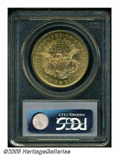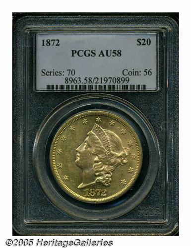 <B>1872<$20> AU58 PCGS.</B></I> Despite being a moderately scarce date, this is one of the Type Two issues that is reasonably available in grades below MS60. Event the AU58 grade is not hard to locate, if one is not too selective about quality. The example offered here is among the finer coins we have seen for the date and grade, and is highly desirable. Lustrous light yellow with frosty surfaces, the reverse being slightly prooflike.