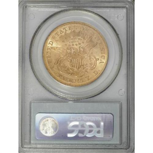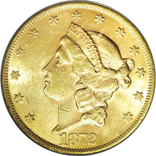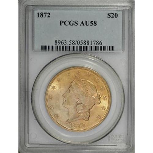 <B>1872 $20 AU58 PCGS.</B></I> A trace of highpoint wear separates this coin from the conditionally rare Mint State grades. The surfaces are lightly abraded as usual, with brilliant, frosty yellow-gold luster, and faint traces of pinkish toning. PCGS has only certified 62 finer examples of the date.<BR><BR><B>Coin Engraver:</B> James B. Longacre<BR><BR><b>Shipping:</b> Coins & Currency (<a target="_blank" href="http://www.heritageauctions.com/common/shipping.php">view shipping information</a>)
