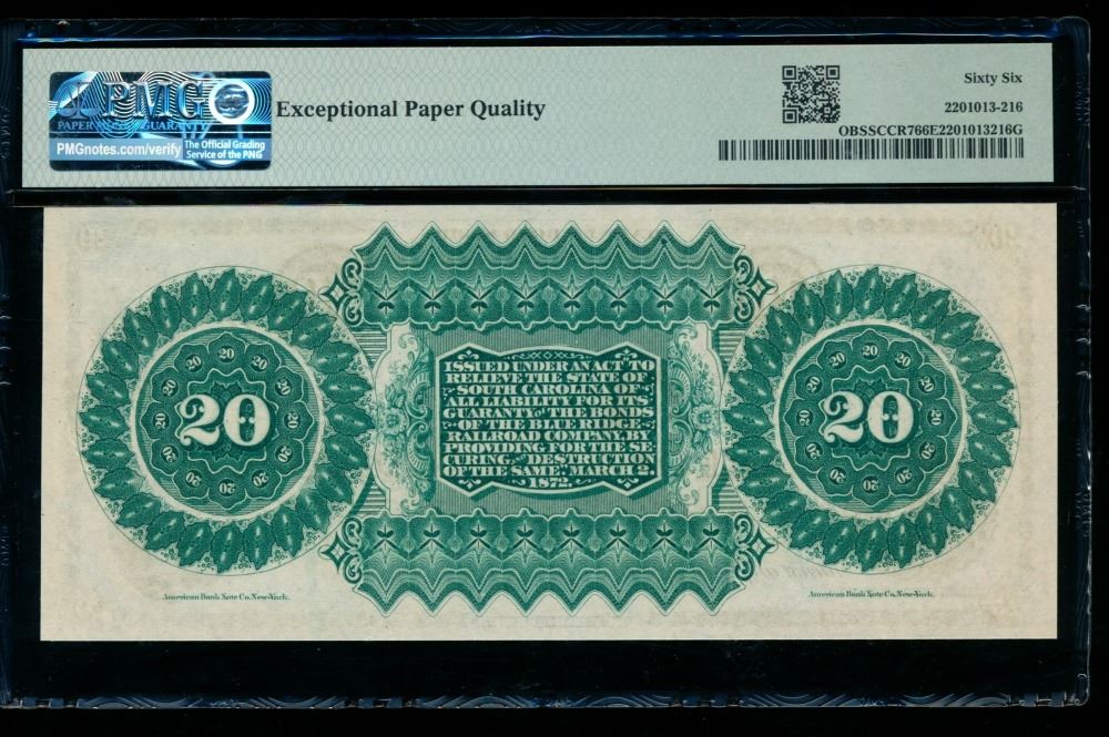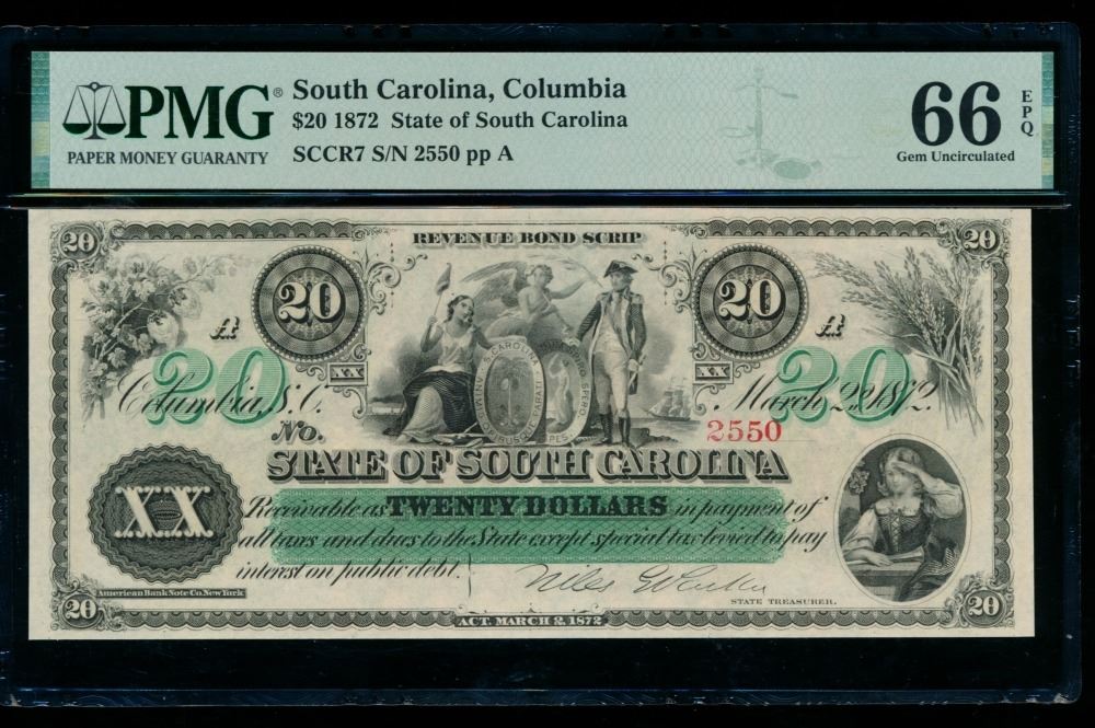 One 1872 $20 Columbia SC Obsolete PMG 66EPQ.