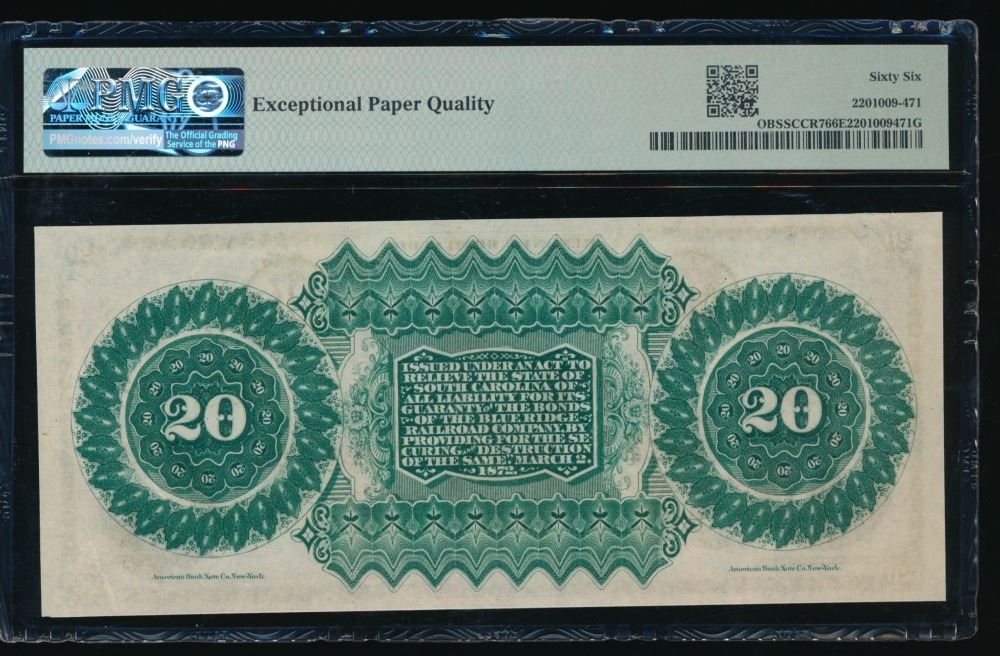 One 1872 $20 Columbia SC Obsolete PMG 66EPQ.