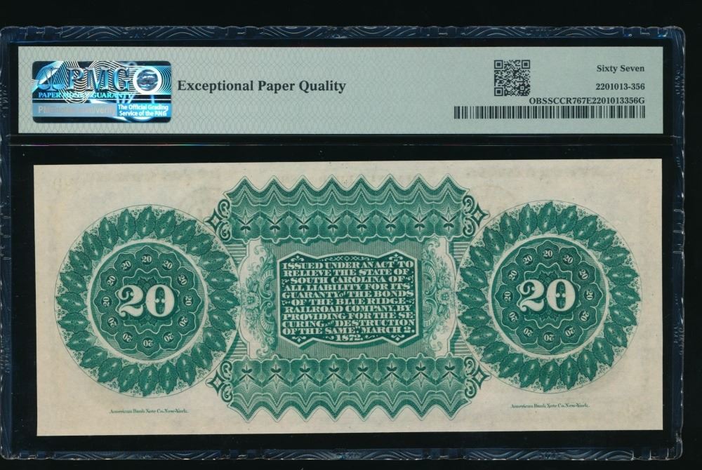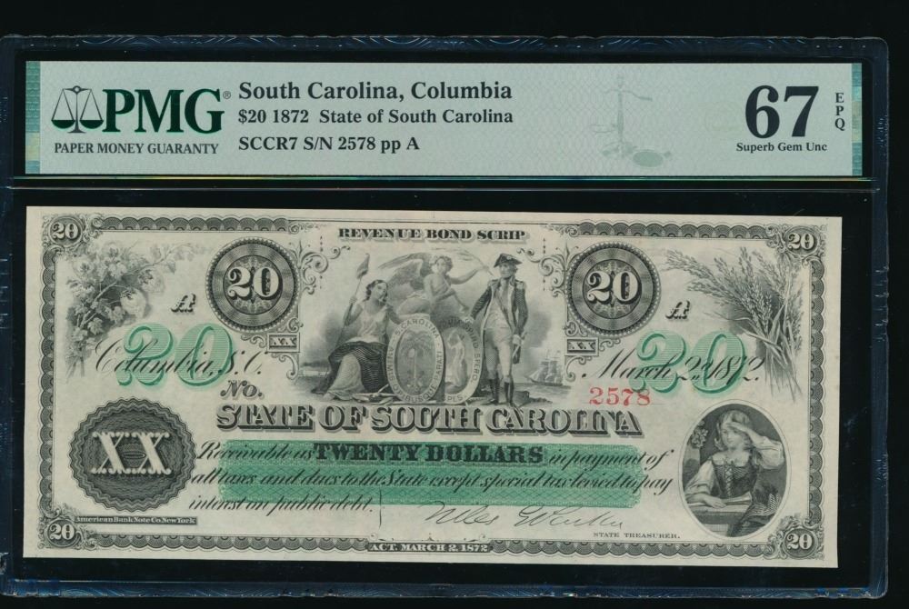 One 1872 $20 Columbia SC Obsolete PMG 67EPQ.
