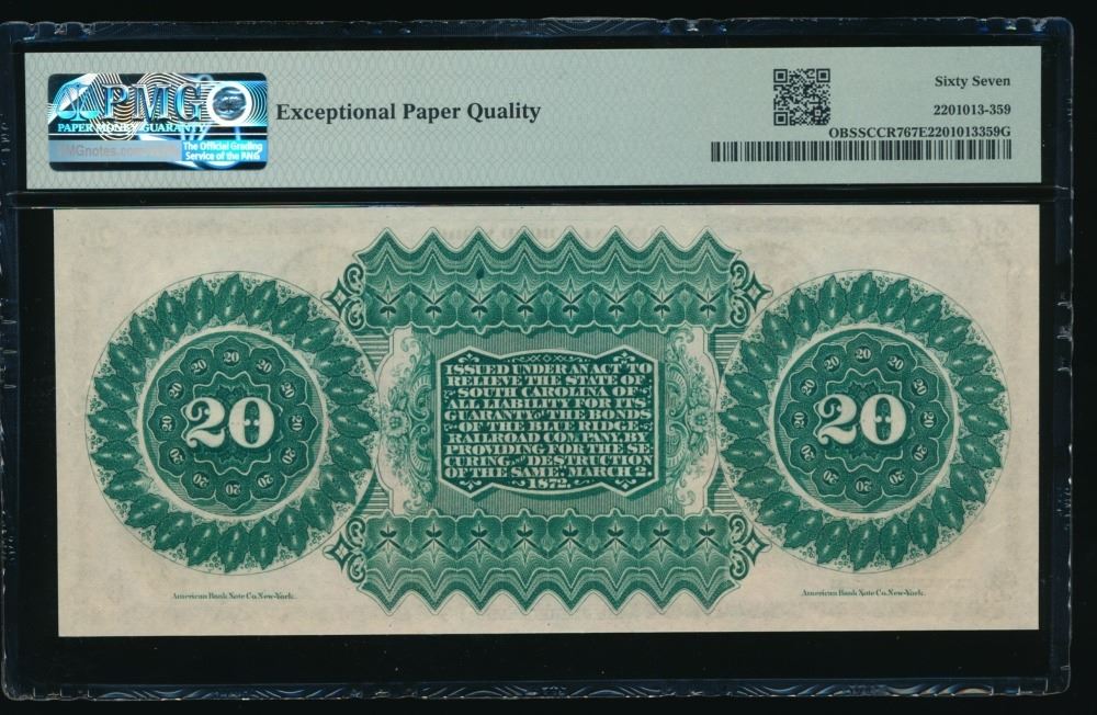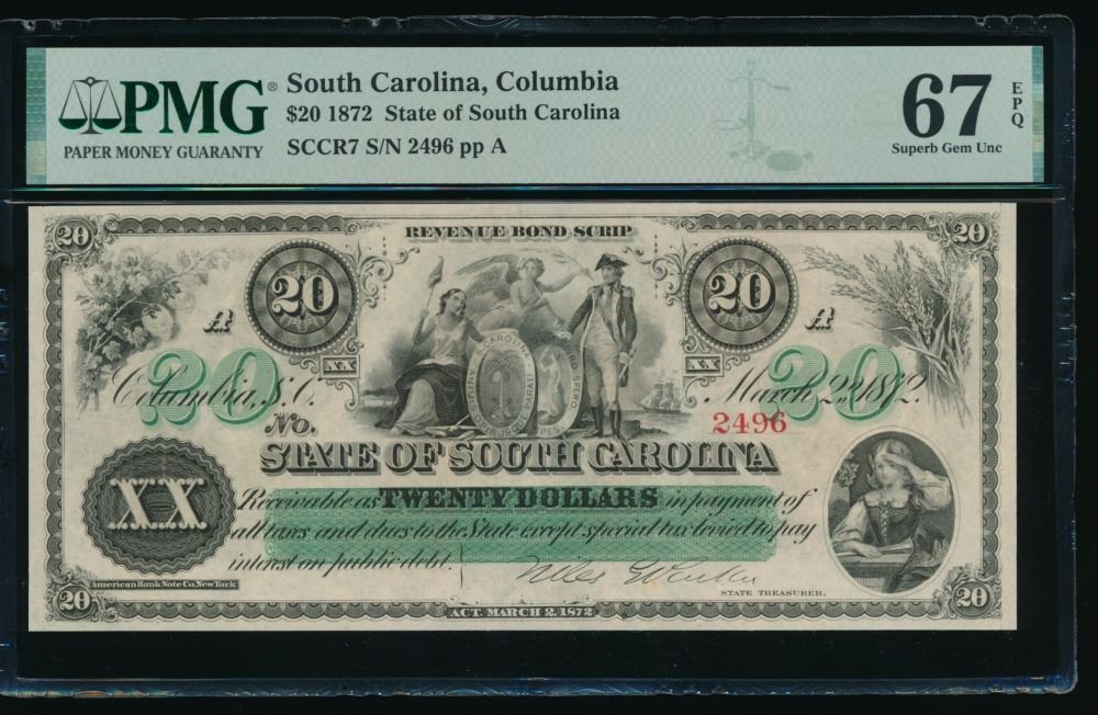 One 1872 $20 Columbia SC Obsolete PMG 67EPQ.