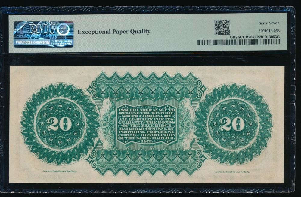 One 1872 $20 Columbia SC Obsolete PMG 67EPQ.