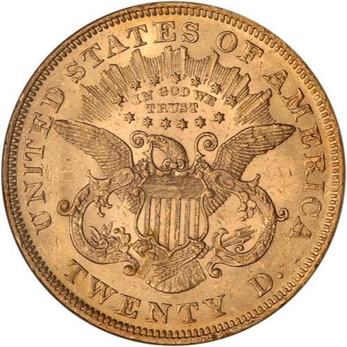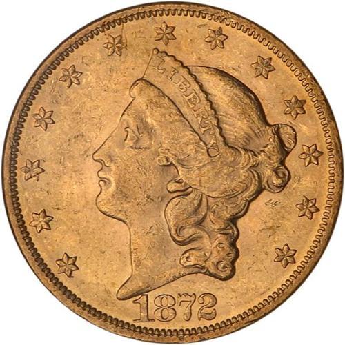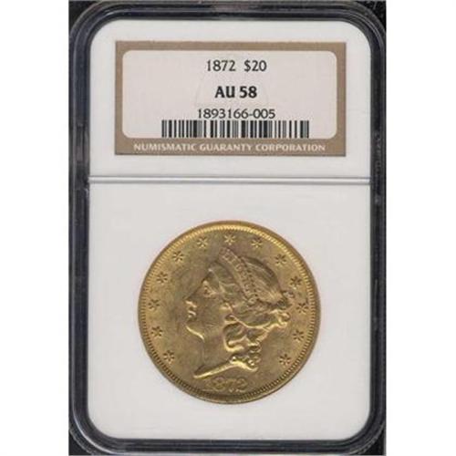 <b>1872 $20 Liberty. NGC graded AU58.</b> NGC Pop: 202. Lustrous and quite well struck within the confines of this Type 2 design. The motto IN GOD WE TRUST appears for the first time on double eagles in 1866, and would remain a part of the tradition through the various changes made to the designs until 1933, when double eagle coinage ceased <b>(PCGS # 8963)</b> <i>