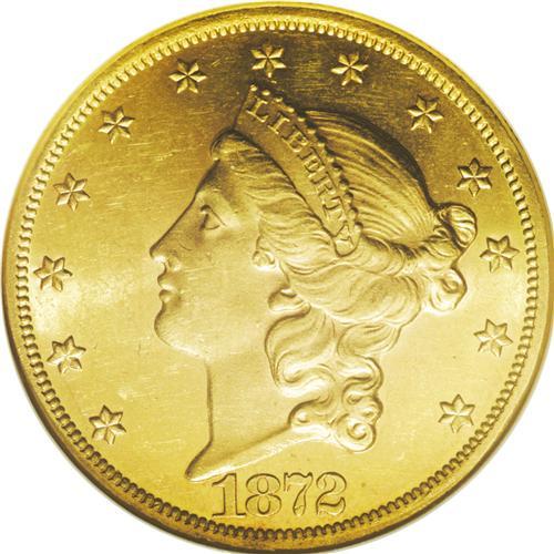 <B>1872<$20> MS62 NGC.</B></I> Although a few Mint State coins are known, most grade MS60 or MS61. This coin is among the finest seen of its issue, and like most double eagles of the period is virtually impossible to find in Choice or finer grades. The attractive, amber-gold surfaces are highly lustrous and sharply struck throughout. A thin scratch extending from the T of LIBERTY nearly to Liberty's mouth will serve to identify this specimen. Faint wispy lines are found in the fields, but no deep or distracting bagmarks are present. The left serif of the 1 is slightly longer than the right serif, and the 2 is a bit low. A nice coin for the grade. Census: 12 in 62, 3 finer (7/06).