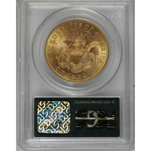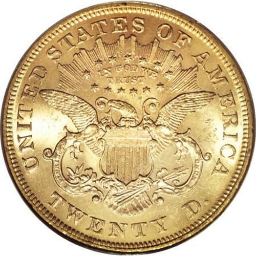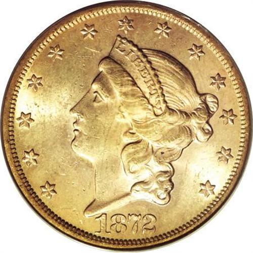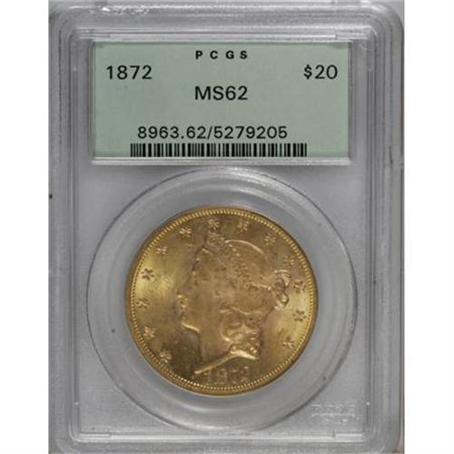<B>1872 $20 MS62 PCGS.</B></I> The 1872 double eagle, with a mintage of 251,850 business strikes, is usually found in Very Fine through About Uncirculated condition. Mint State coins are rare, and occur mostly in MS60 and MS61 grades. PCGS and NGC have certified fewer than 20 specimens in MS62, a mere three in MS63, and a single near-Gem. No Gem quality examples have yet been certified.<BR> Apricot-gold patina bathes both sides of this MS62 coin, and is joined by mint-green on the reverse. The design elements are generally well brought up. Soft luster resides on the lightly abraded surfaces. Housed in a green-label holder.<BR><BR><B>Coin Engraver:</B> James B. Longacre<BR><BR><b>Shipping:</b> Coins & Currency (<a target="_blank" href="http://www.heritageauctions.com/common/shipping.php">view shipping information</a>)