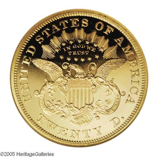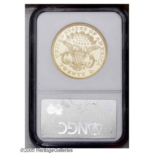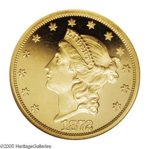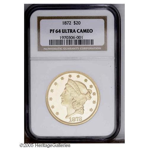 <B>1872<$20> PR64 Deep Cameo NGC.</B></I> Profoundly contrasted with yellow-gold mirrored surfaces of illimitable depth and excellent strength of detail. Although the desirability of this rare specimen is not noticeably diminished, a few wispy hairlines are clustered in the field to the left of the portrait. Trivial luster grazes are also noted in the area of Liberty's mouth along with a paper-thin blemish over her curls to the right of the ear. The total sum of these distractions has kept it from Gem status, but has hardly affected the coin's considerable aesthetic appeal.<BR> It seems to this cataloger that the overall rarity of proof gold coinage from the late 19th century and early 20th century creates an undeserved complacency for those earlier issues that are seen with even less frequency. An excellent illustration of this is the proof 1872 Double Eagle. The Philadelphia Mint was still finding customers for the fledgling proof gold coin market hard to come by in 1872. Well healed buyers with a strong interest in numismatics were reliable, but few. Perhaps more understandably, twenty dollars was at this time more money than the average American made working a 60-hour week. It is little wonder that this issue's mintage of 30 proofs is roughly the average for the entire decade. Lack of proper numismatic maintenance and ensuing hard times would cause the number of unimpaired survivors to dwindle even further. So it is with a great deal of enthusiasm that we present this rare 1870s proof twenty, one of perhaps fewer than a dozen unimpounded survivors and the first we have ever offered through auction. Census: 2 in 64 Deep Cameo, 0 finer (11/05).