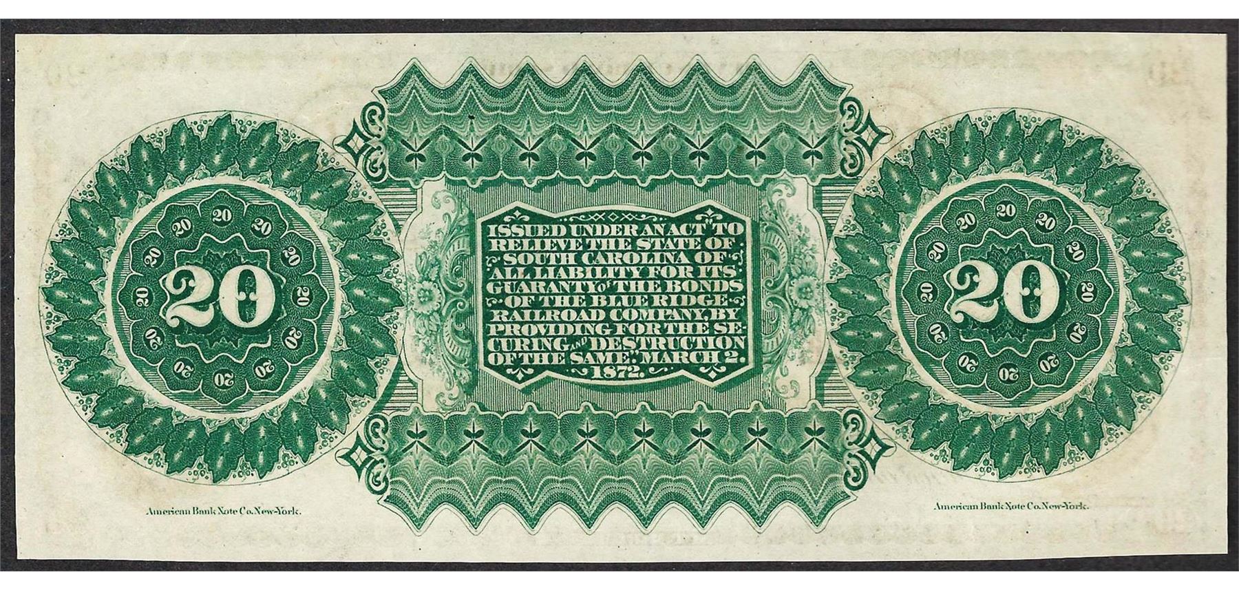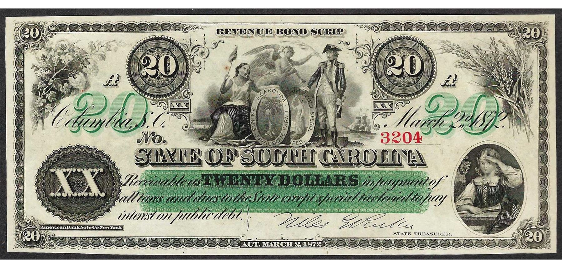 One 1872 $20 State of South Carolina Obsolete Bank Note.
