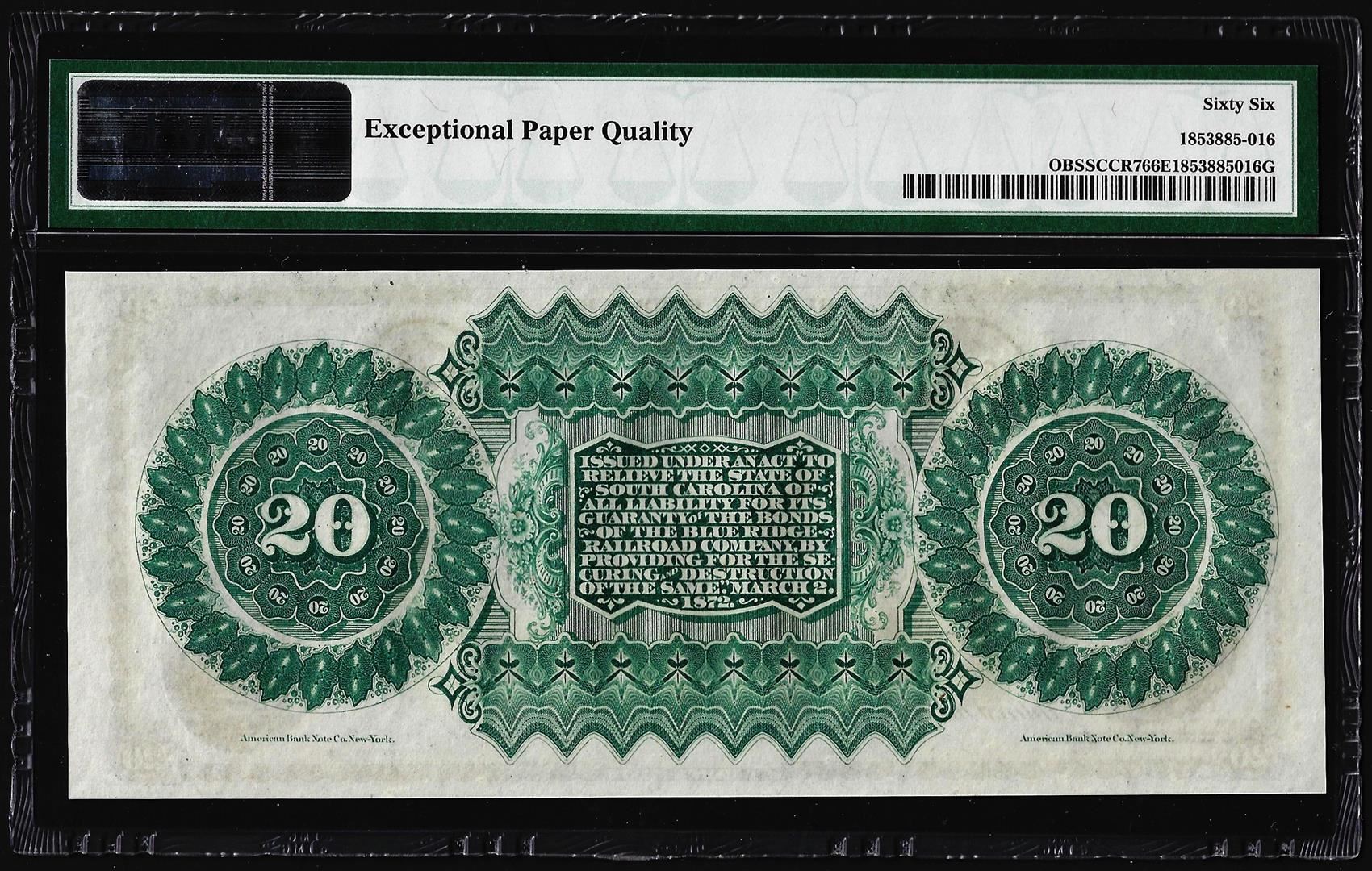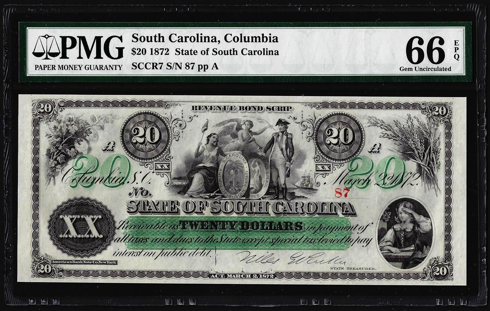 1872 $20 State of South Carolina Obsolete Note PMG Gem Unc. 66EPQ Low Serial Number