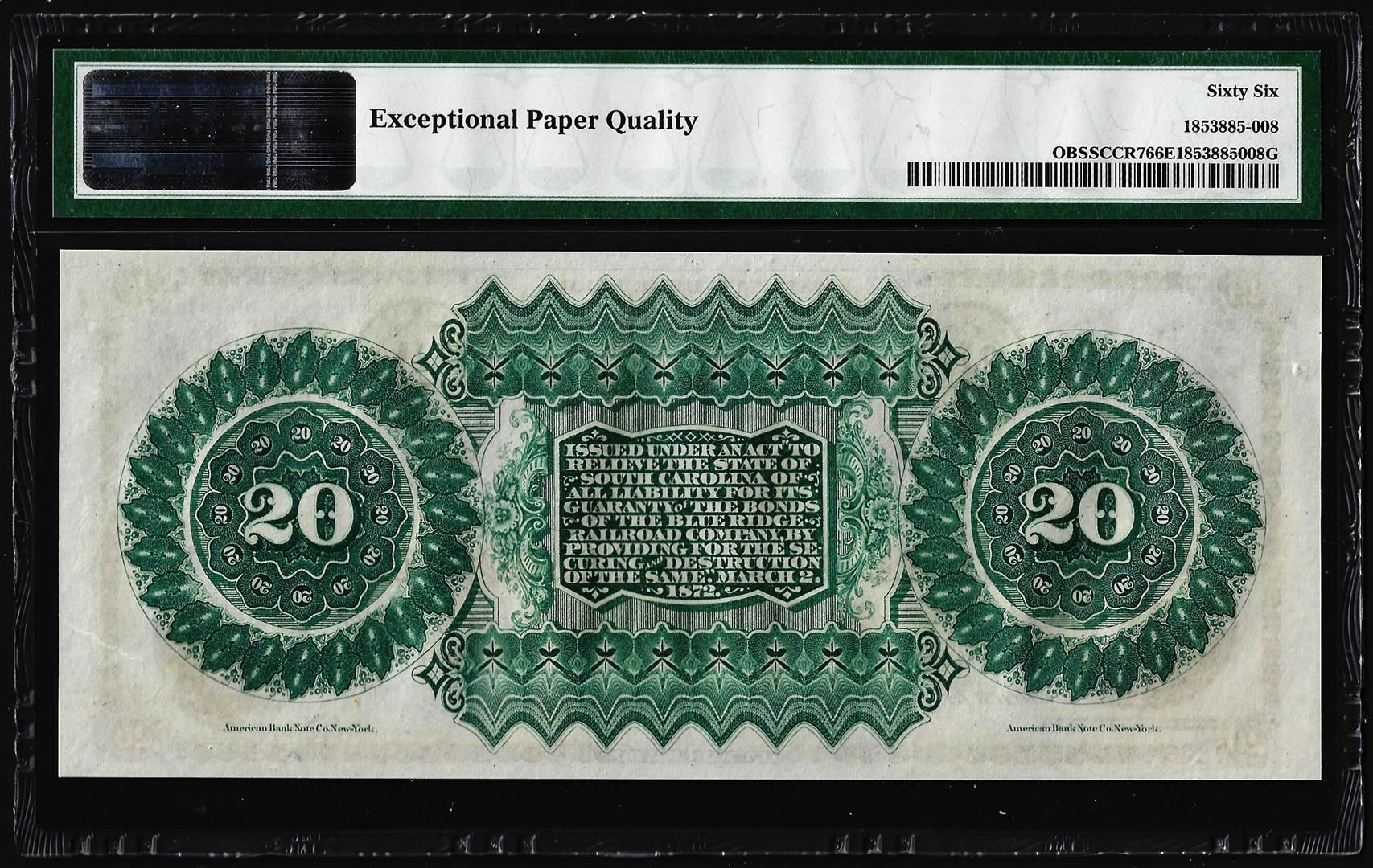 1872 $20 State of South Carolina Obsolete Note PMG Gem Unc. 66EPQ Low Serial Number
