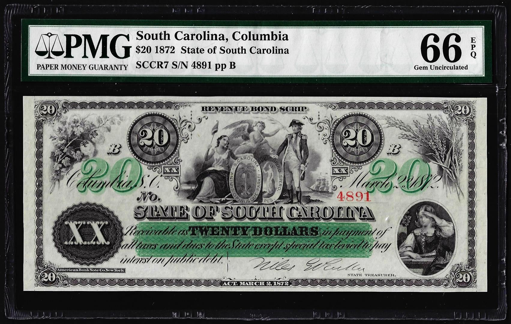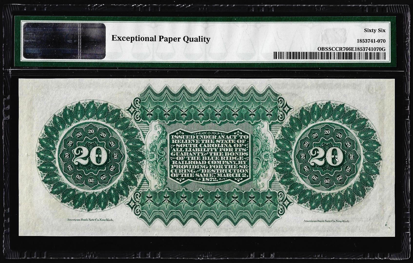 One 1872 $20 State of South Carolina Obsolete Note PMG Gem Uncirculated 66EPQ. PMG Certified.