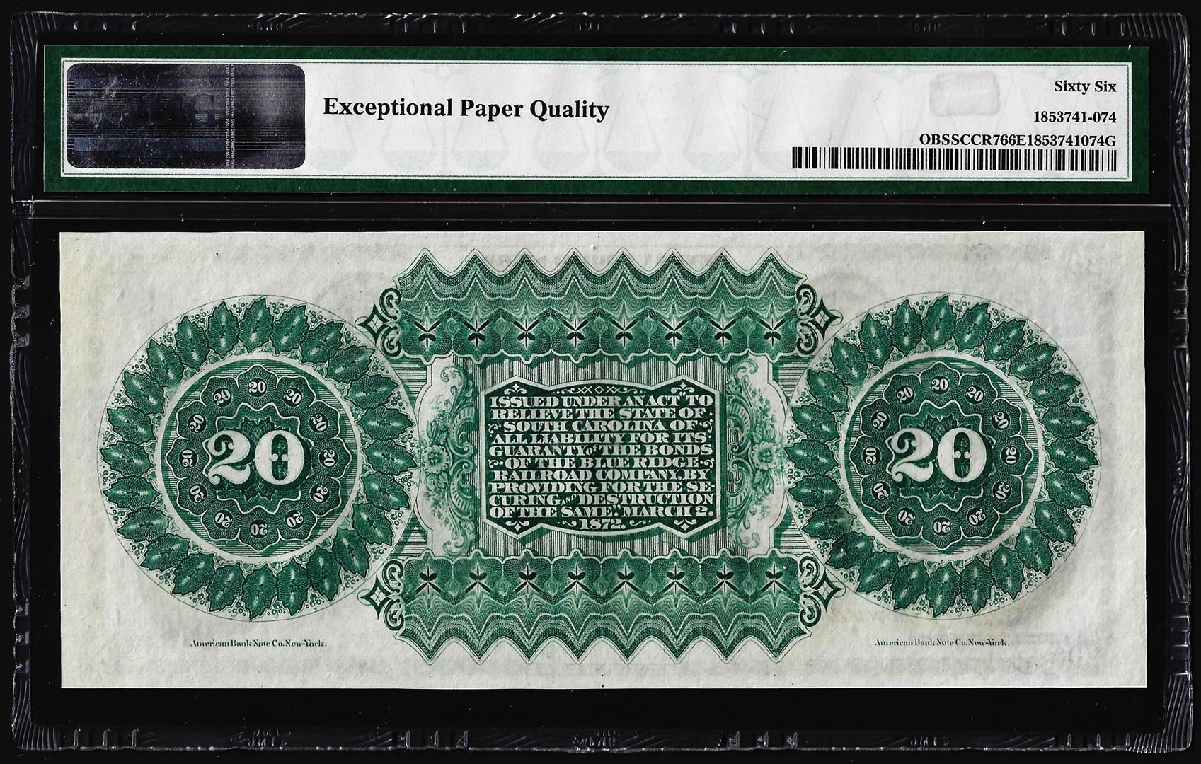 One 1872 $20 State of South Carolina Obsolete Note PMG Gem Uncirculated 66EPQ. PMG Certified.