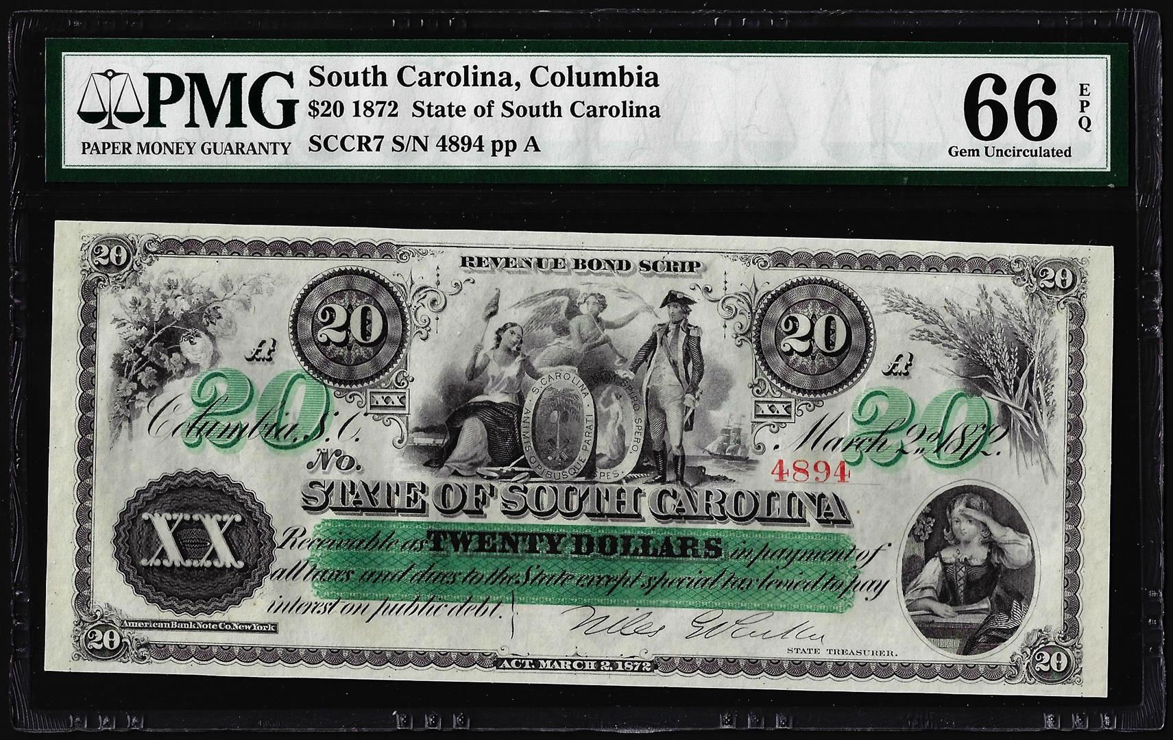 One 1872 $20 State of South Carolina Obsolete Note PMG Gem Uncirculated 66EPQ. PMG Certified.
