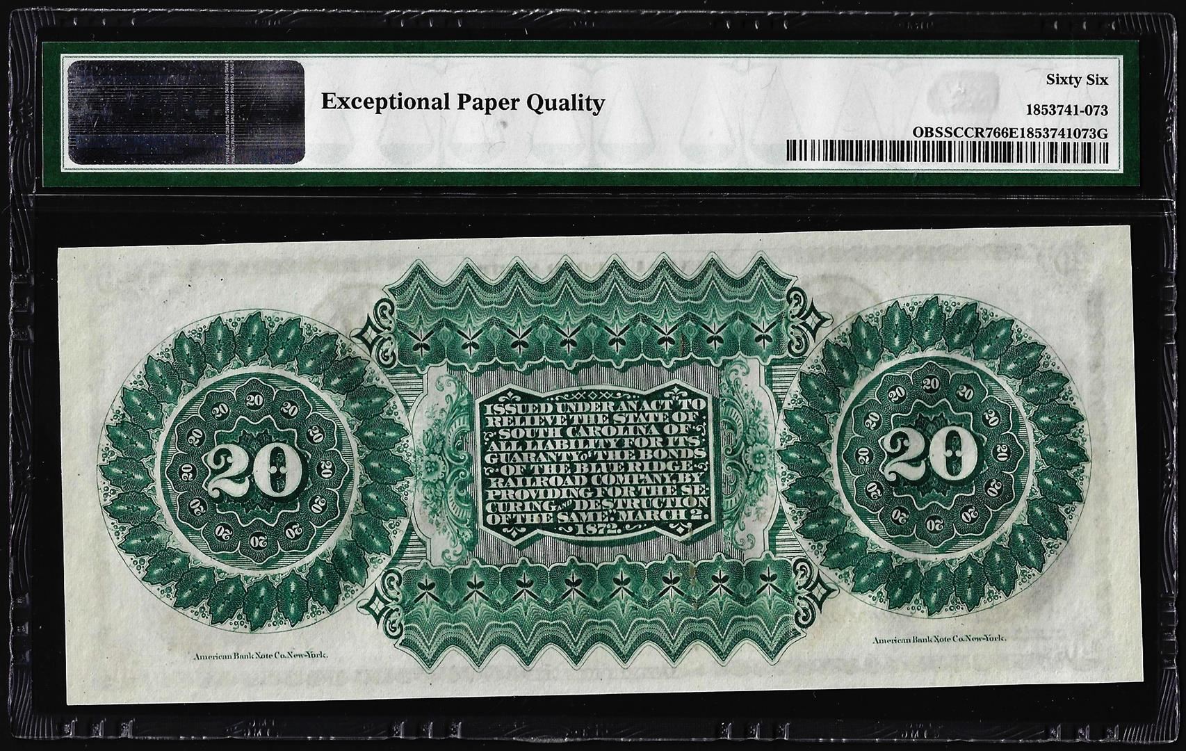 1872 $20 State of South Carolina Obsolete Note PMG Gem Uncirculated 66EPQ