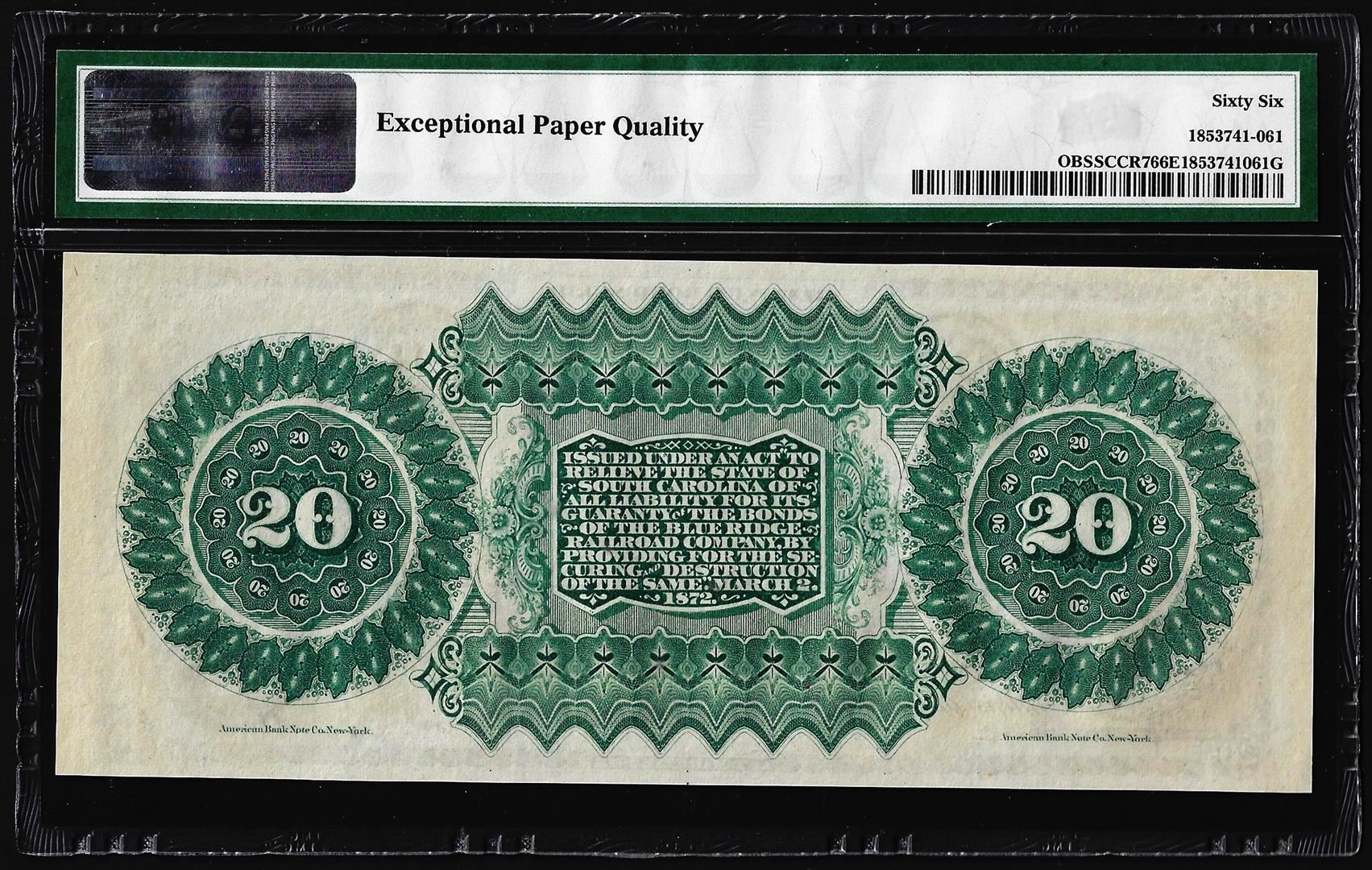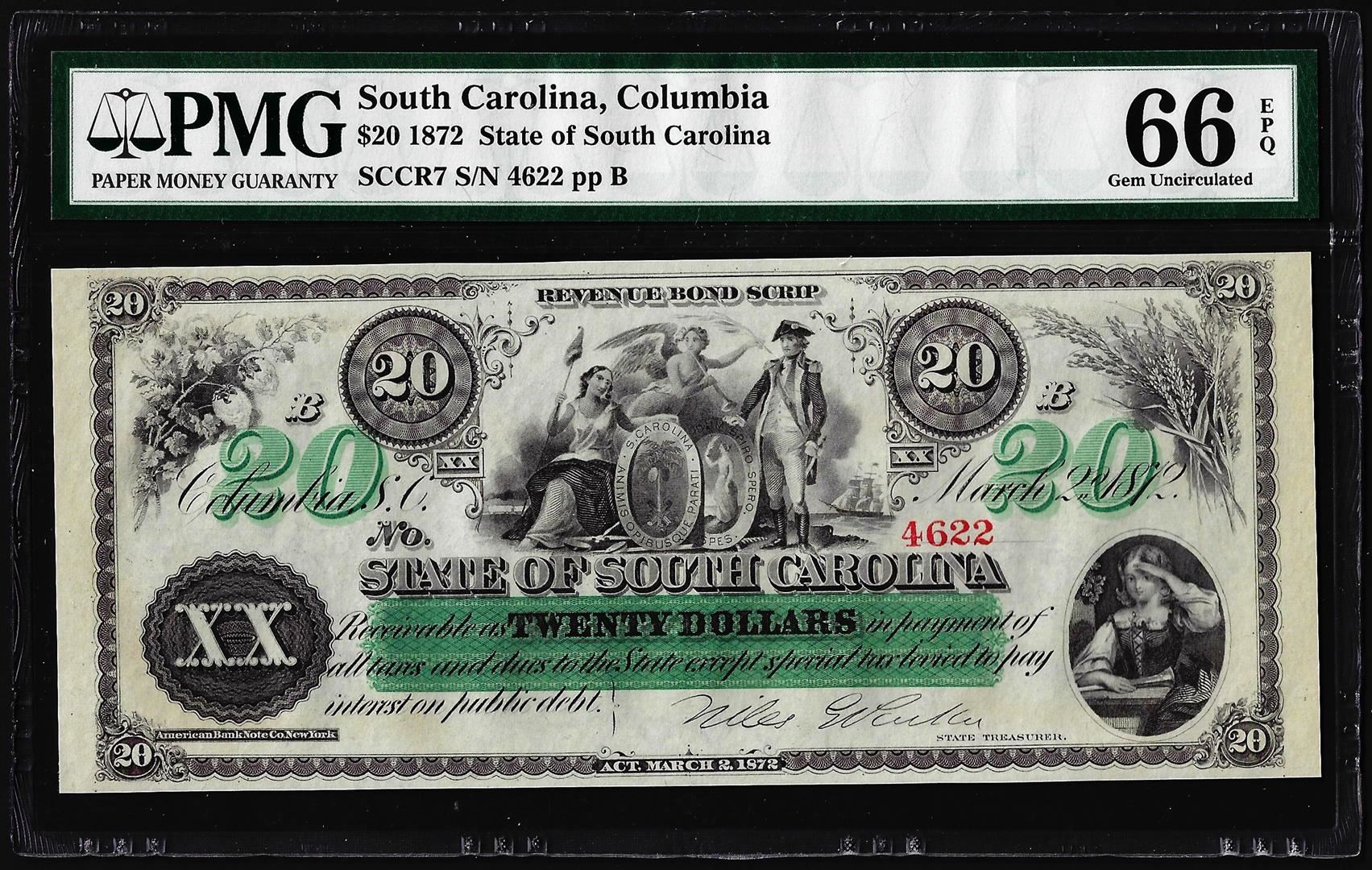 One 1872 $20 State of South Carolina Obsolete Note PMG Gem Uncirculated 66EPQ. PMG Certified.