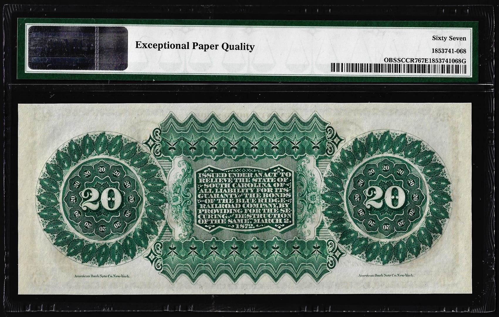 One 1872 $20 State of South Carolina Obsolete Note PMG Superb Gem Unc 67EPQ. PMG Certified.