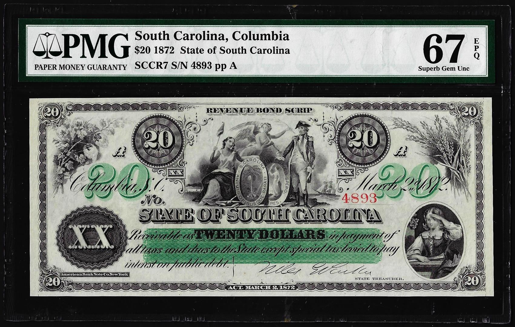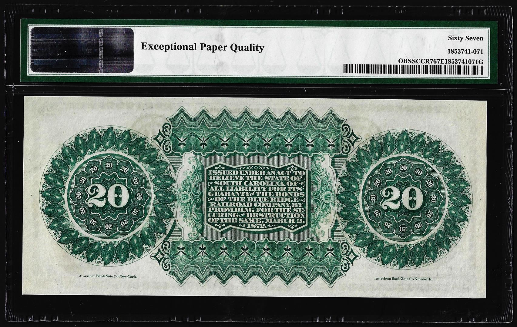 One 1872 $20 State of South Carolina Obsolete Note PMG Superb Gem Unc 67EPQ. PMG Certified.