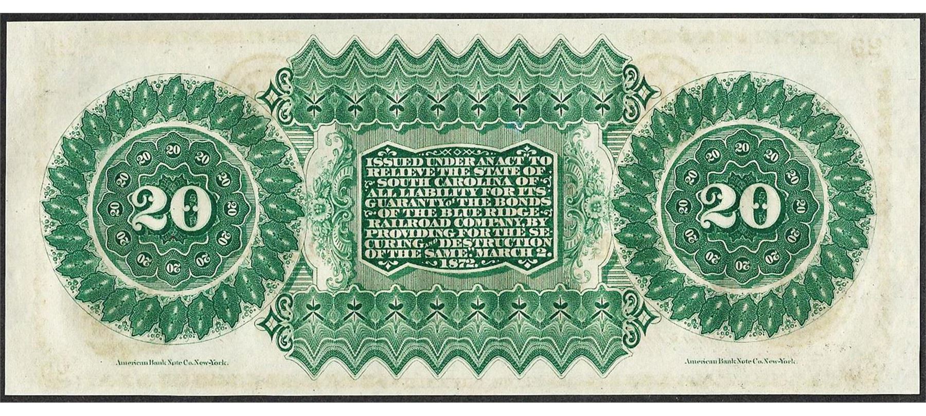 1872 $20 State of South Carolina Revenue Bond Obsolete Note Low Serial Number