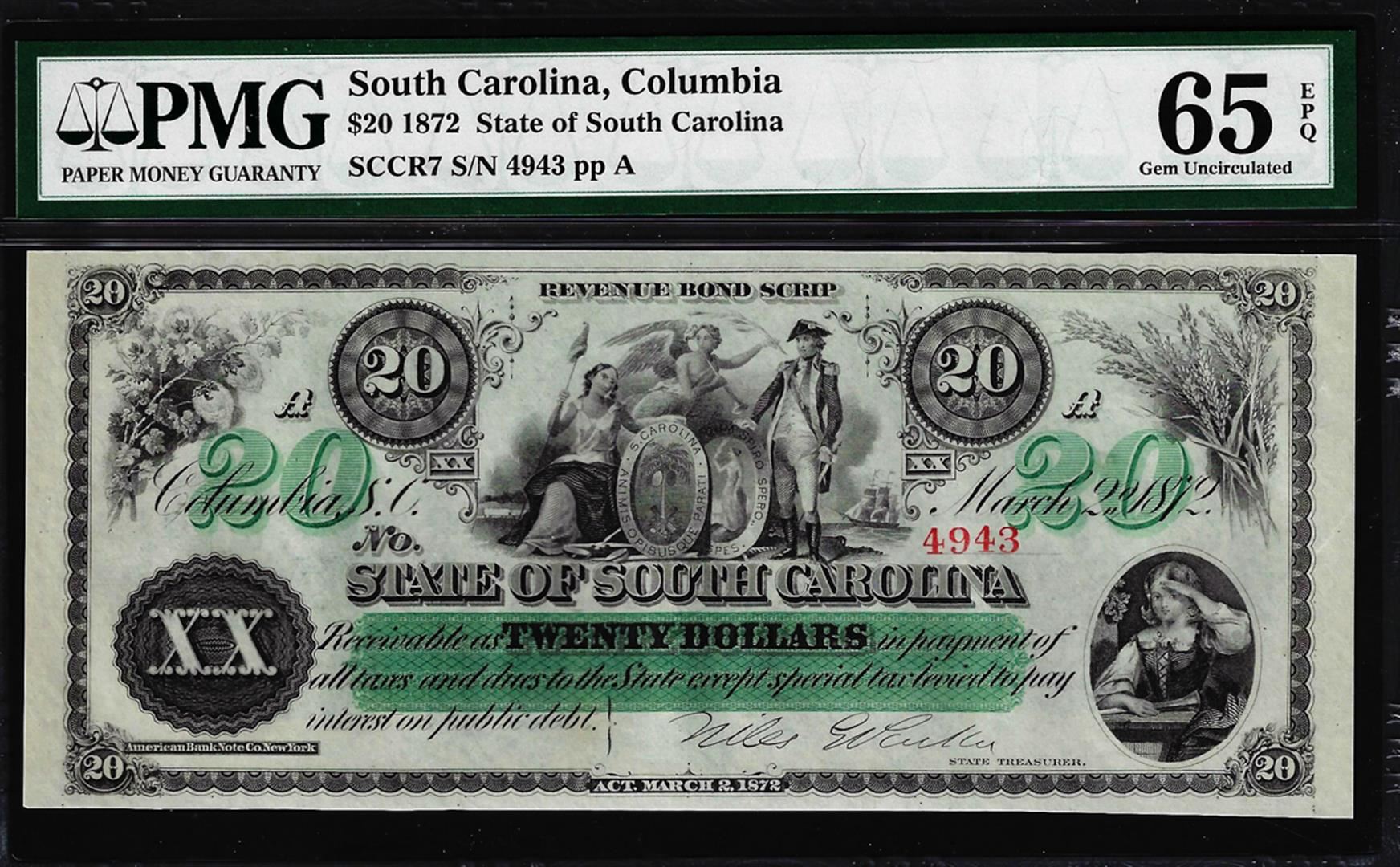 1872 $20 State of South Carolina Revenue Bond Obsolete Note PMG Gem Uncirculated 65EPQ