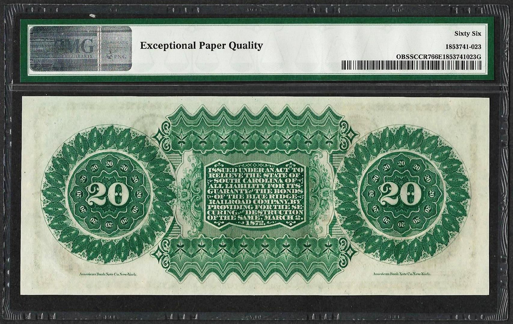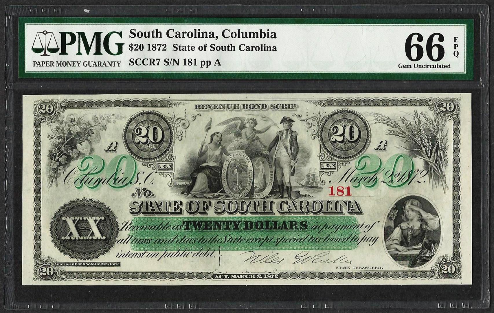 1872 $20 State of South Carolina Revenue Bond Obsolete Note PMG Gem Uncirculated 66EPQ