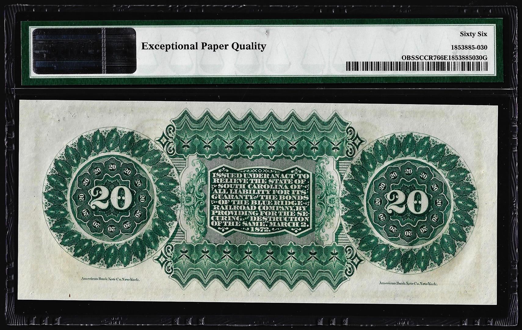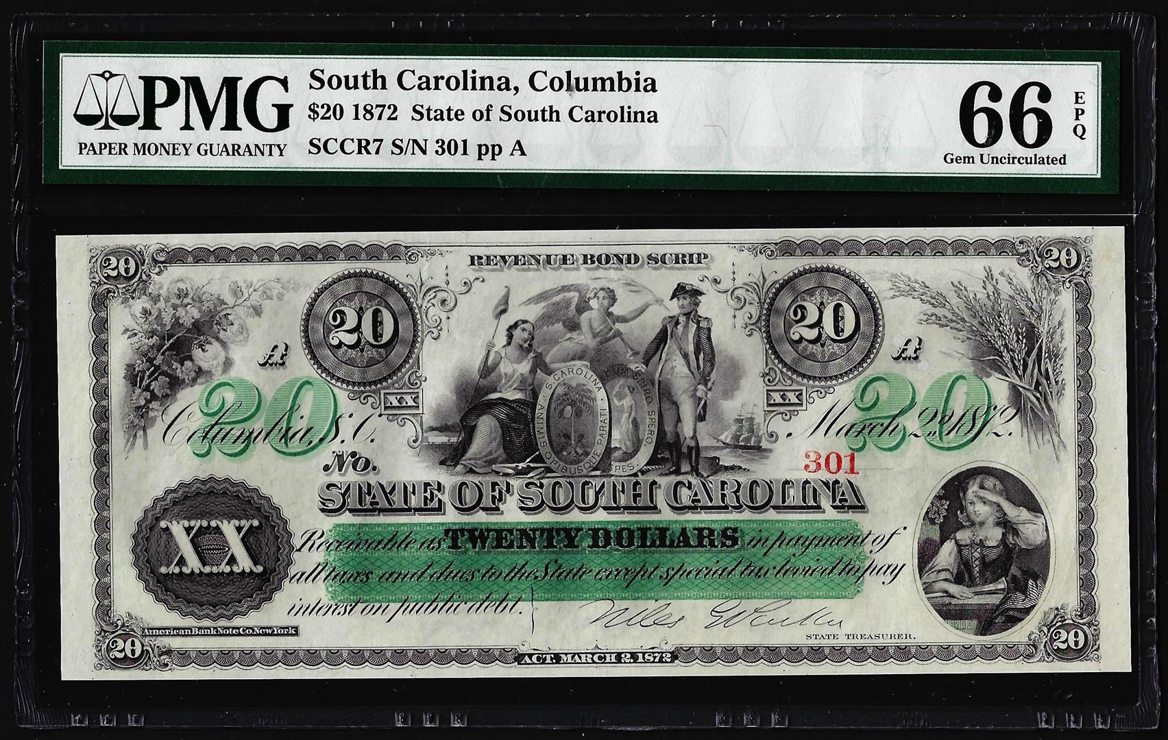 1872 $20 State of South Carolina Revenue Bond Obsolete Note PMG Gem Uncirculated 66EPQ