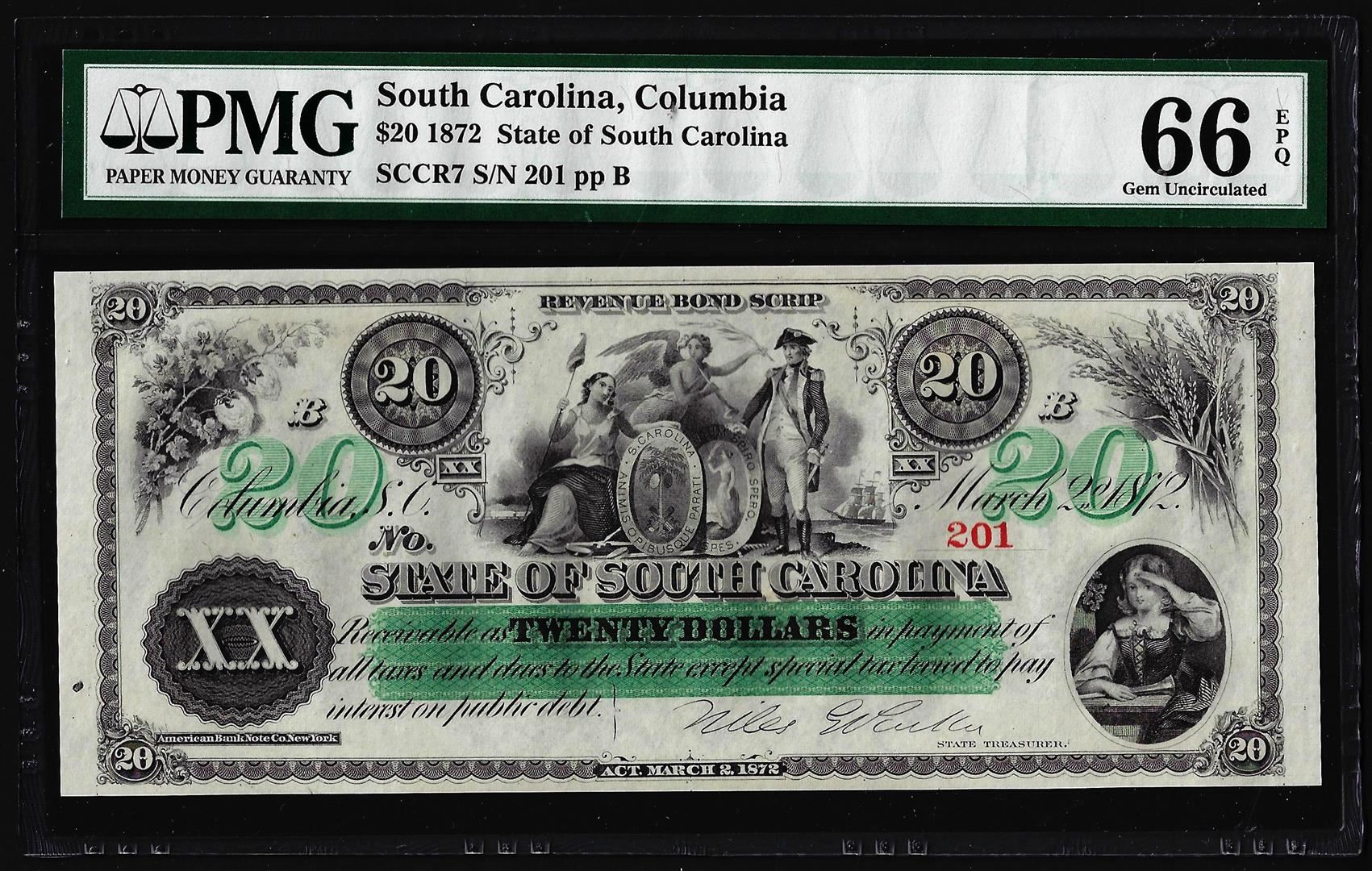 One 1872 $20 State of South Carolina Revenue Bond Obsolete Note PMG Gem Uncirculated 66EPQ. PMG Certified.