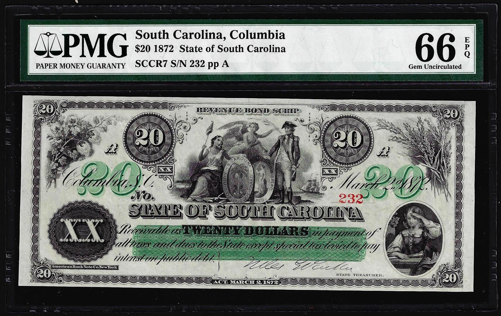 1872 $20 State of South Carolina Revenue Bond Obsolete Note PMG Gem Uncirculated 66EPQ
