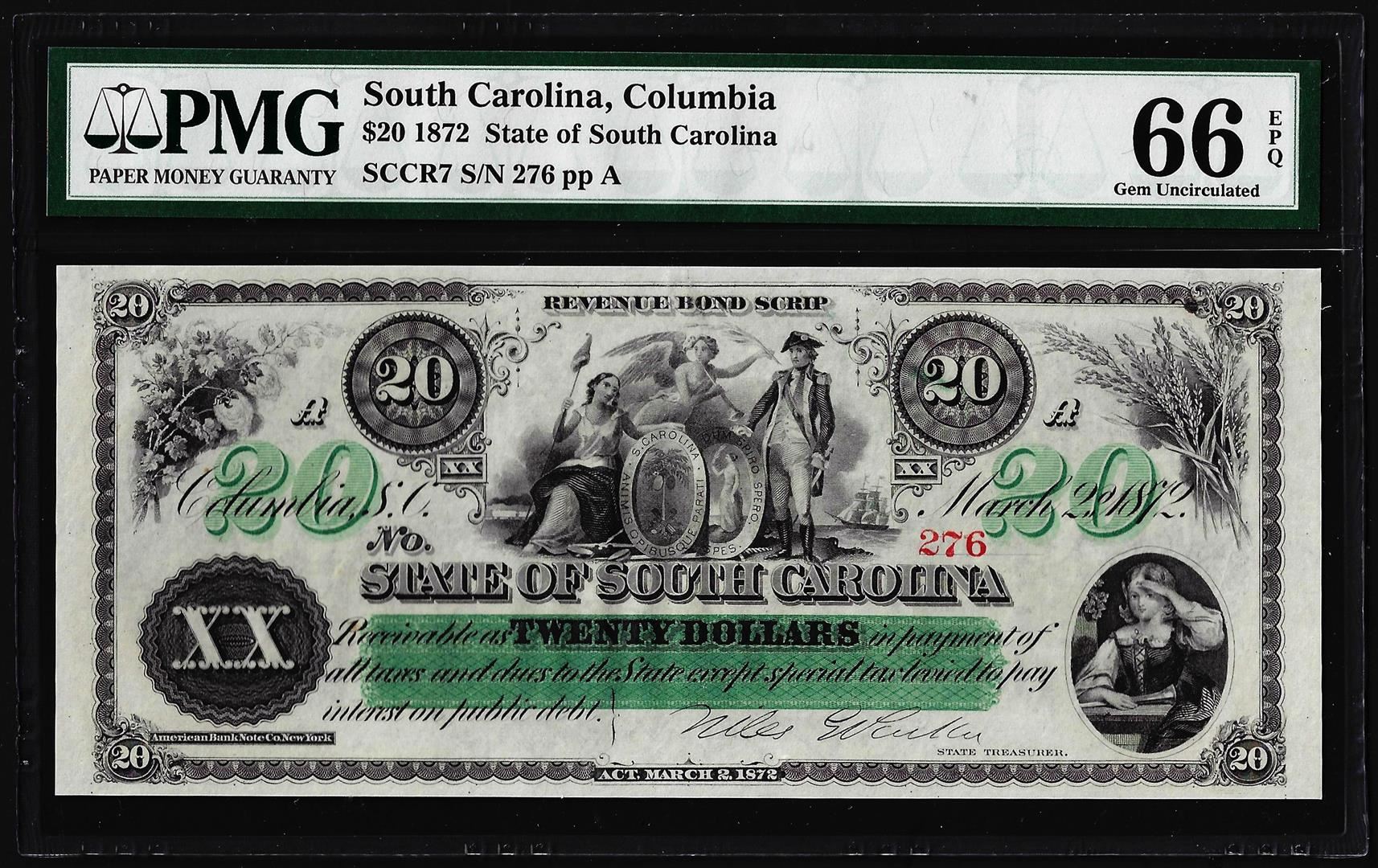 1872 $20 State of South Carolina Revenue Bond Obsolete Note PMG Gem Uncirculated 66EPQ